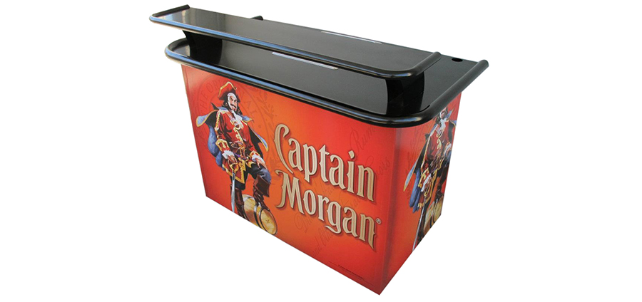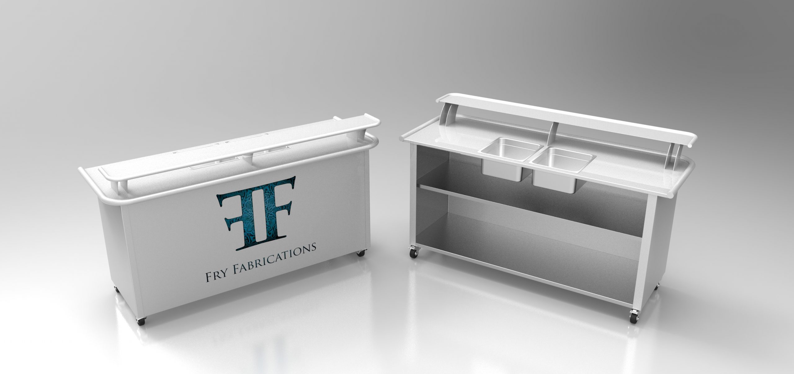 Here is our sleek FF-PB03 portable bar. Included is a drink shelf for serving and 2 large drop-in ice bins and an open lower storage space with a shelf. This bar can be powder coated in a variety of colors and wrapped in printed media to showcase any company name, logo or graphic.