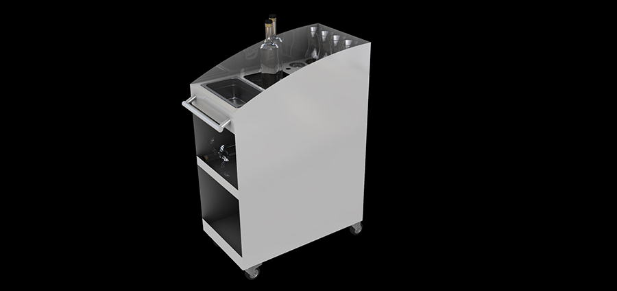 Like the PC01 this cart has is another way to serve your guests in elegance in 100% steel. This cart has the shelf and lower spacing as well as an ice pan, 4 carafes, and 2 garnish bowls on the top of the cart of ease of access when serving. A custom handle, industrial wheels and large single-piece wrap-around design is perfect for promoting your brand.
